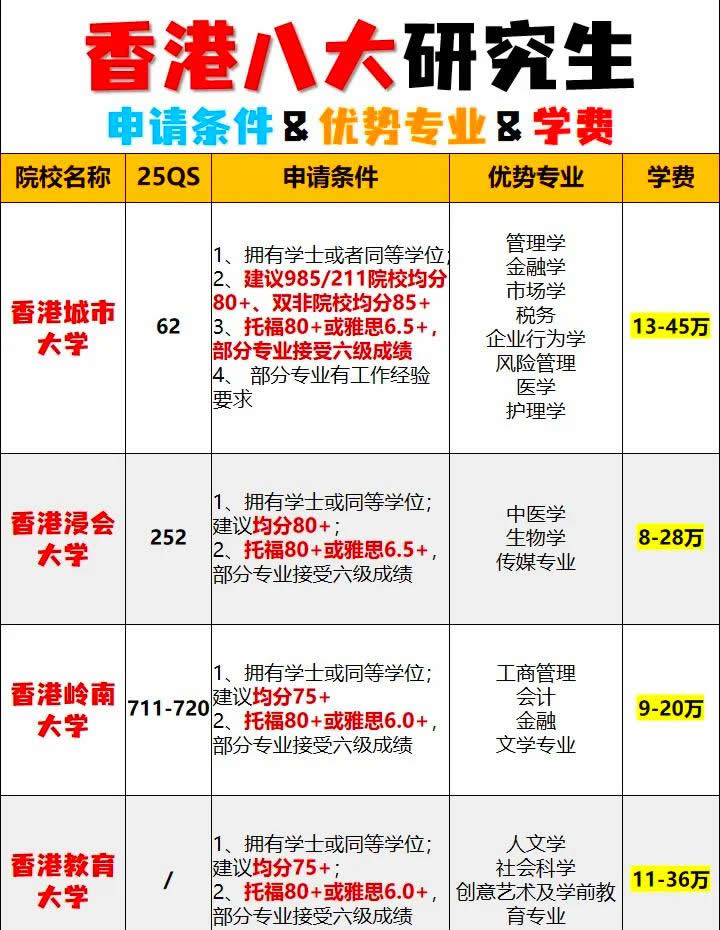 近年来,越来越多的同学选择去香港读研究生。那么,香港八大高校的研究生申请条件有哪些?学费大概是多少?有哪些优势专业呢?