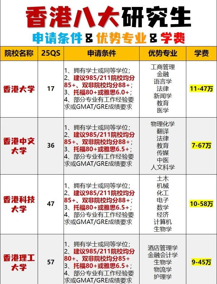 近年来,越来越多的同学选择去香港读研究生。那么,香港八大高校的研究生申请条件有哪些?学费大概是多少?有哪些优势专业呢?